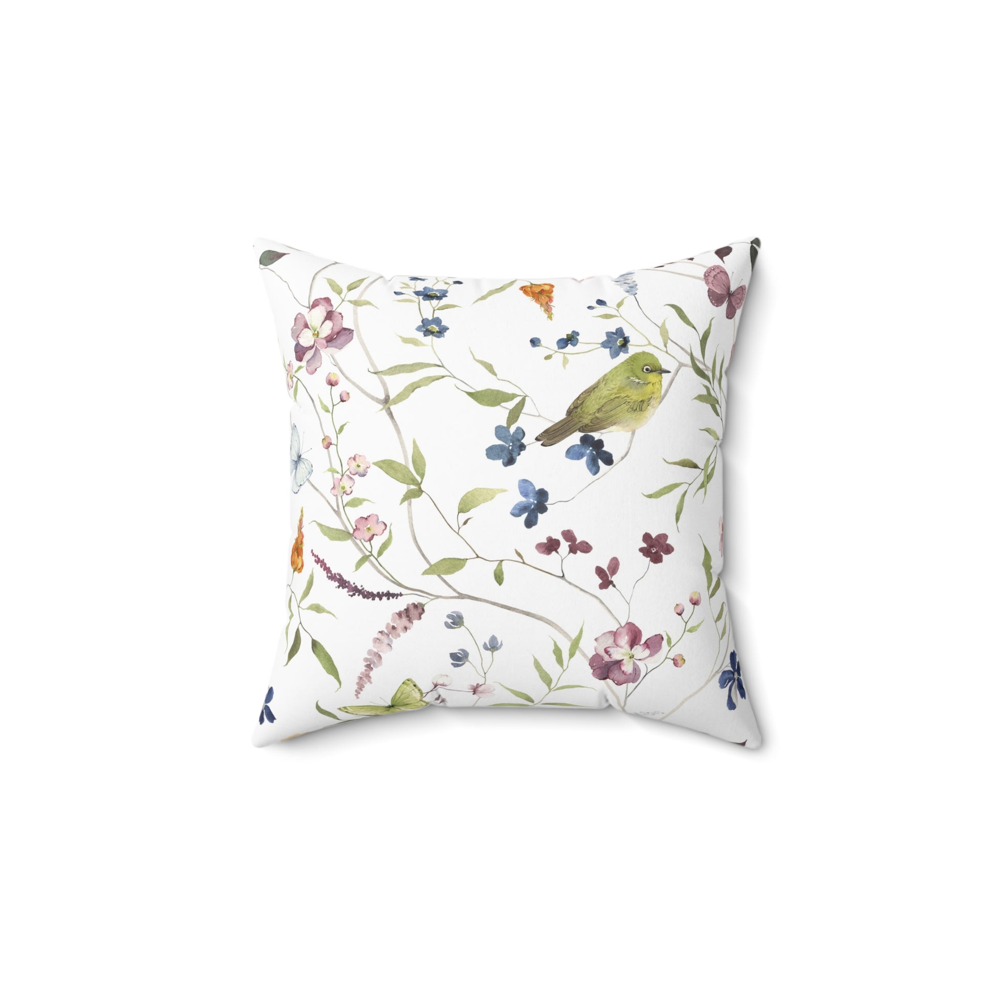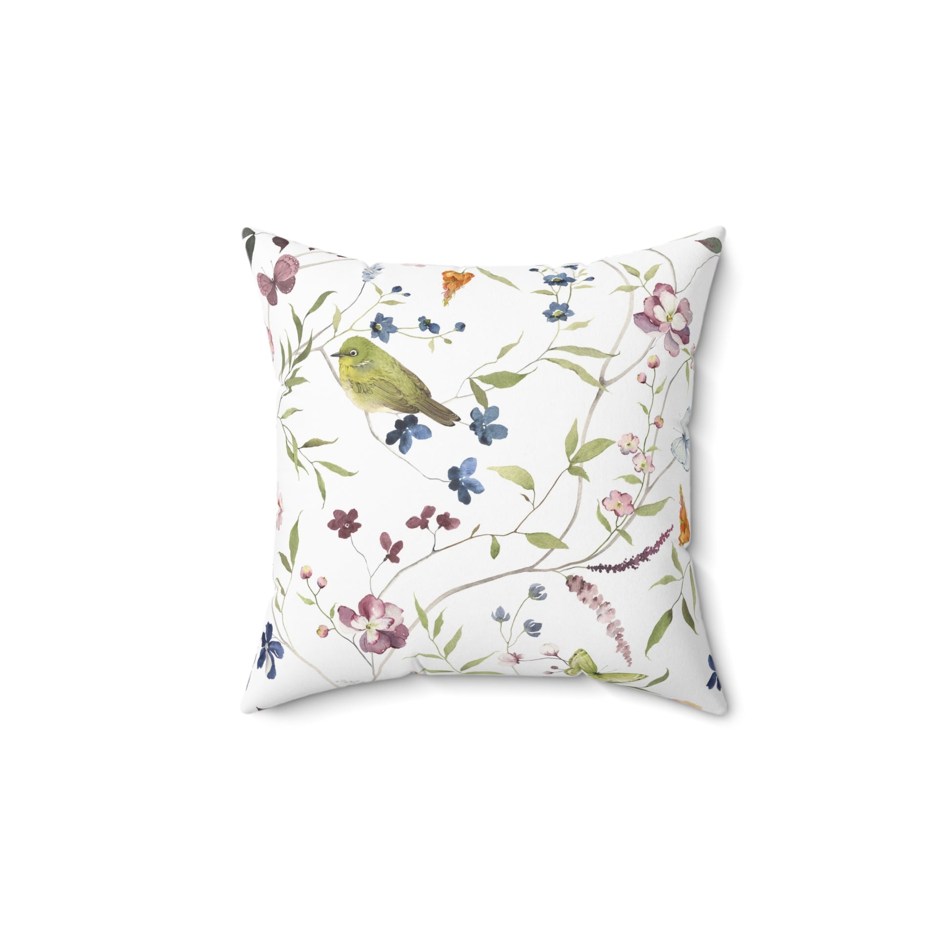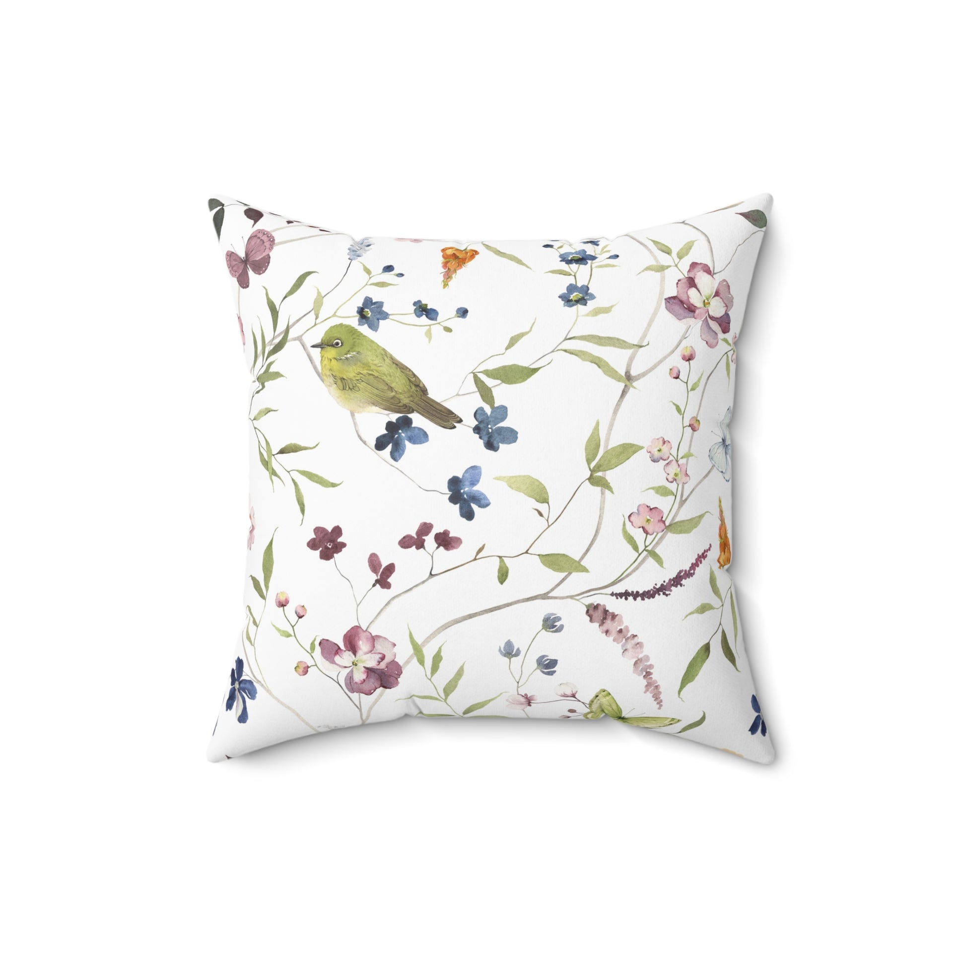 Elevate your home decor with this exquisite square pillow, designed to bring a touch of nature indoors. Featuring a vibrant floral and bird motif, this pillow sets a cheerful and inviting atmosphere in any space. It's perfect for adding a pop of color in your living room, bedroom, or cozy reading nook. Ideal for nature lovers, home decorators, or anyone looking to refresh their home style. This pillow makes a thoughtful gift for housewarmings, weddings, or seasonal celebrations like spring and summer gatherings, where a touch of floral elegance is appreciated.