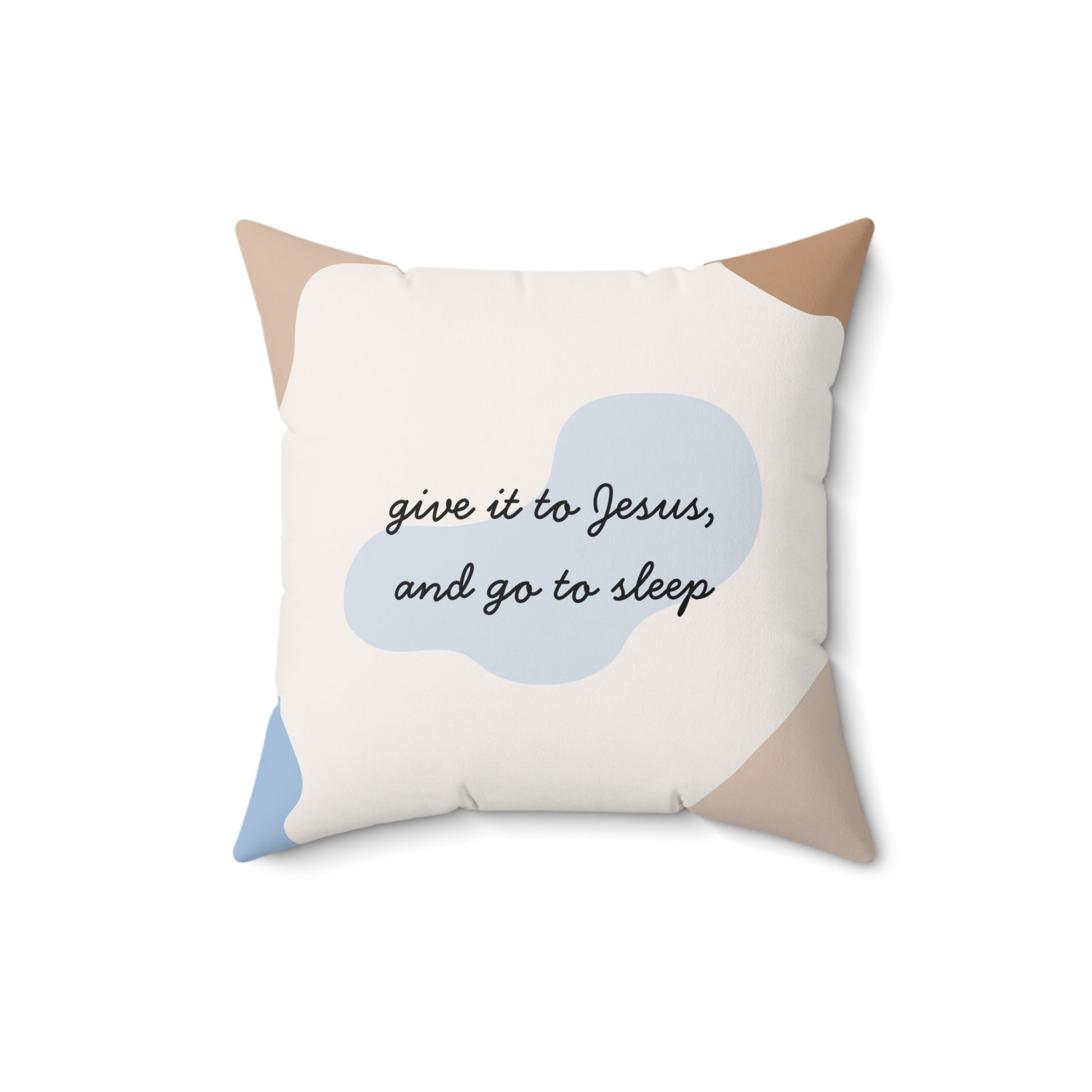 Soft, square pillow with a calm, faith-forward message: “give it to Jesus, and go to sleep.” Subtle abstract shapes in sandy beige and pale blue float on a creamy background, creating a cozy, restful look that blends into any cozy space. The double-sided print keeps the design visible from every angle while the concealed zipper preserves the clean lines. Lightweight and resilient spun polyester holds its shape and resists wrinkles, and the generously overstuffed recycled polyester insert blooms into a plush, cloud-like cushion once assembled. Tuck it on a bed, a favorite armchair, or a rocking chair to bring a quiet moment of reassurance and softness to the room.