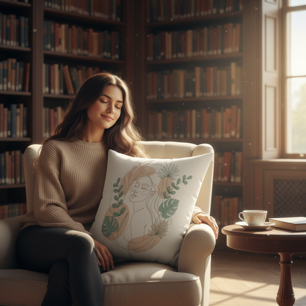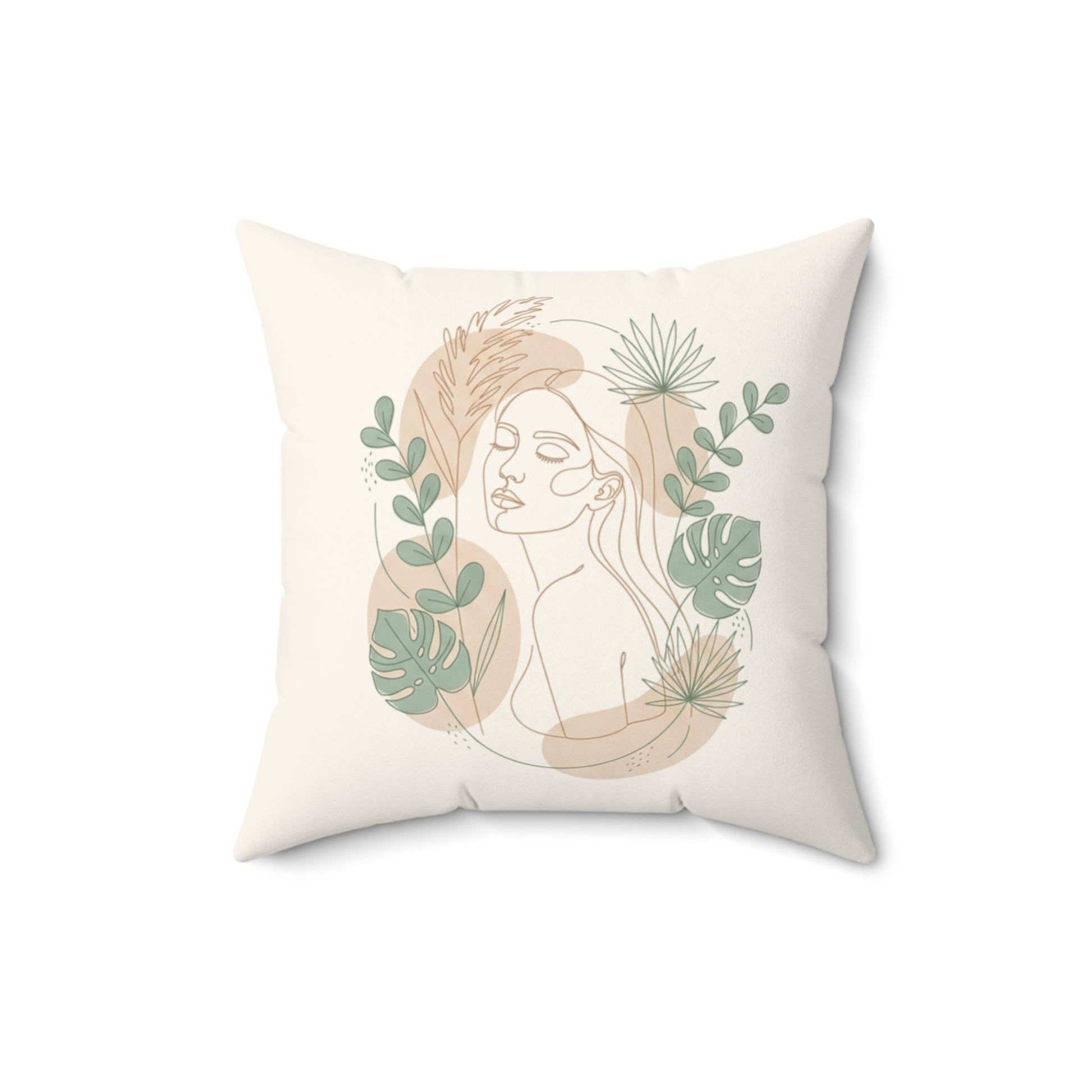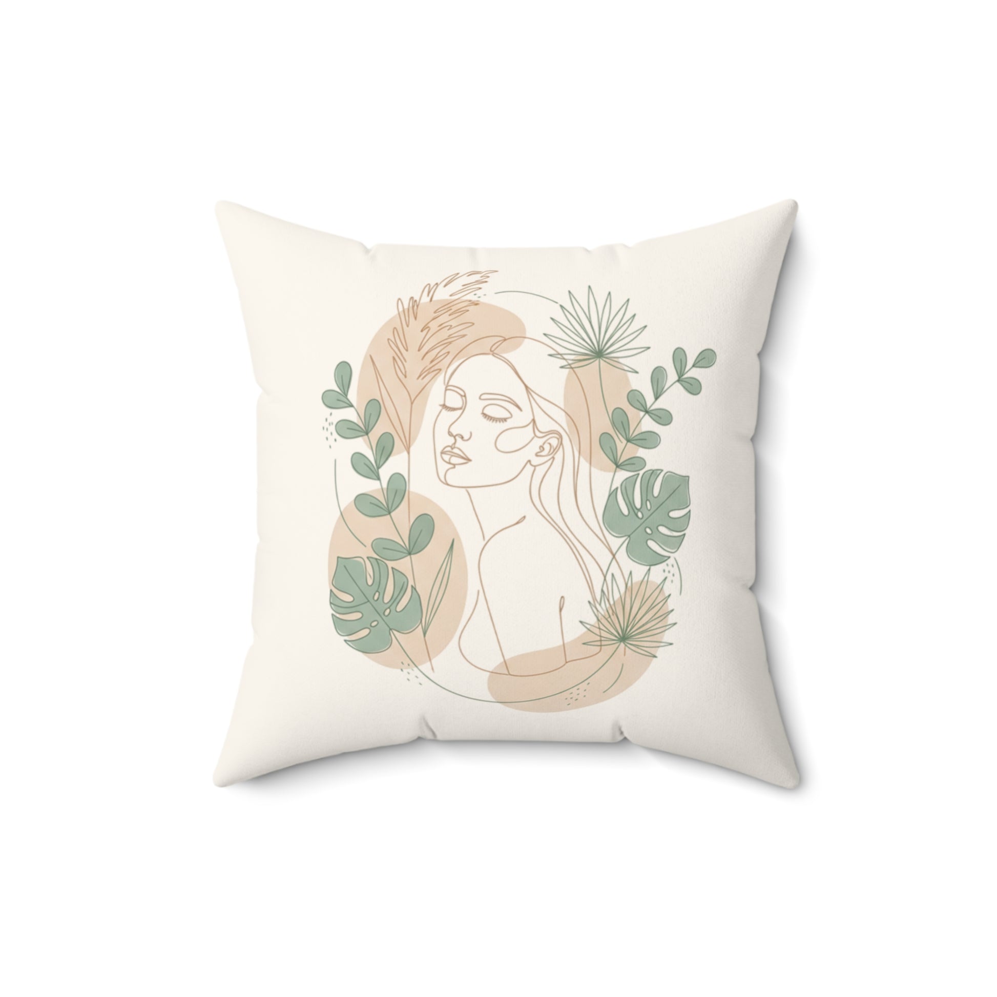 This square throw pillow brings calm, cozy, and natural elegance to any room. A soft, cream backdrop frames a minimalist line-portrait of a serene woman, surrounded by muted sage leaves, palm fronds and warm beige botanical shapes. The double-sided print keeps the art visible from every angle, while the slightly over-stuffed recycled polyester insert gives the pillow a plush, sculpted look once assembled. It slips into living rooms, reading nooks, and sunlit bedrooms where a cozy, botanical accent is wanted. The neutral palette pairs easily with woven throws, rattan furniture, and calming, earthy decor for a collected, serene vibe.