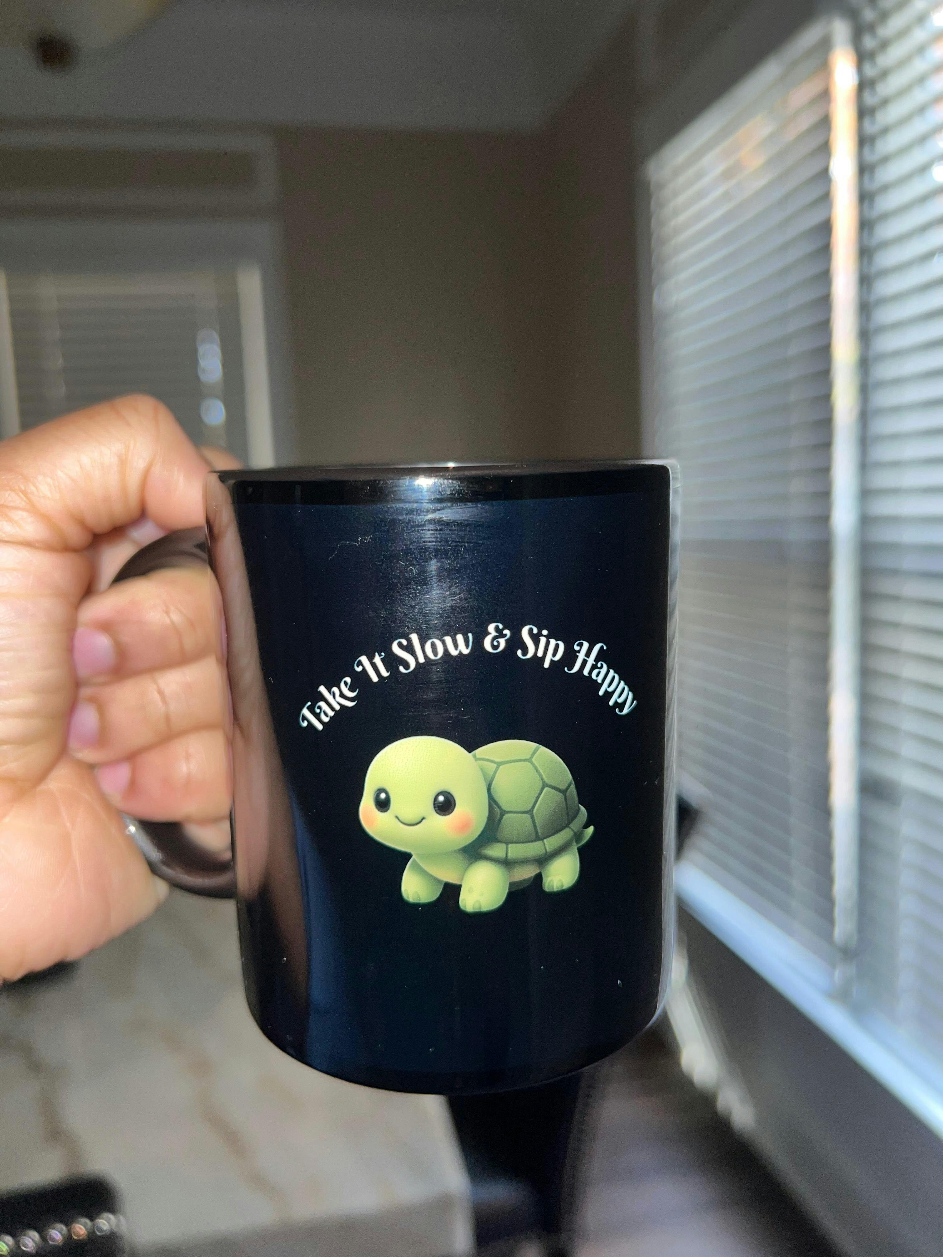 A glossy black ceramic mug that brings a gentle smile to slow mornings and busy workdays. A sweet, chubby turtle illustration sits front and center with the phrase “Take it Slow & Sip Happy,” reminding you to breathe between sips. The deep black background makes the soft, warm colors of the turtle pop. It’s sturdy, comfortable to hold with a C-shaped handle, and withstands everyday use — microwave and dishwasher-safe so your ritual stays simple. This mug fits naturally into cozy routines: quiet kitchen counters, mindful coffee breaks, or a calming desk companion that quietly encourages a slower pace.